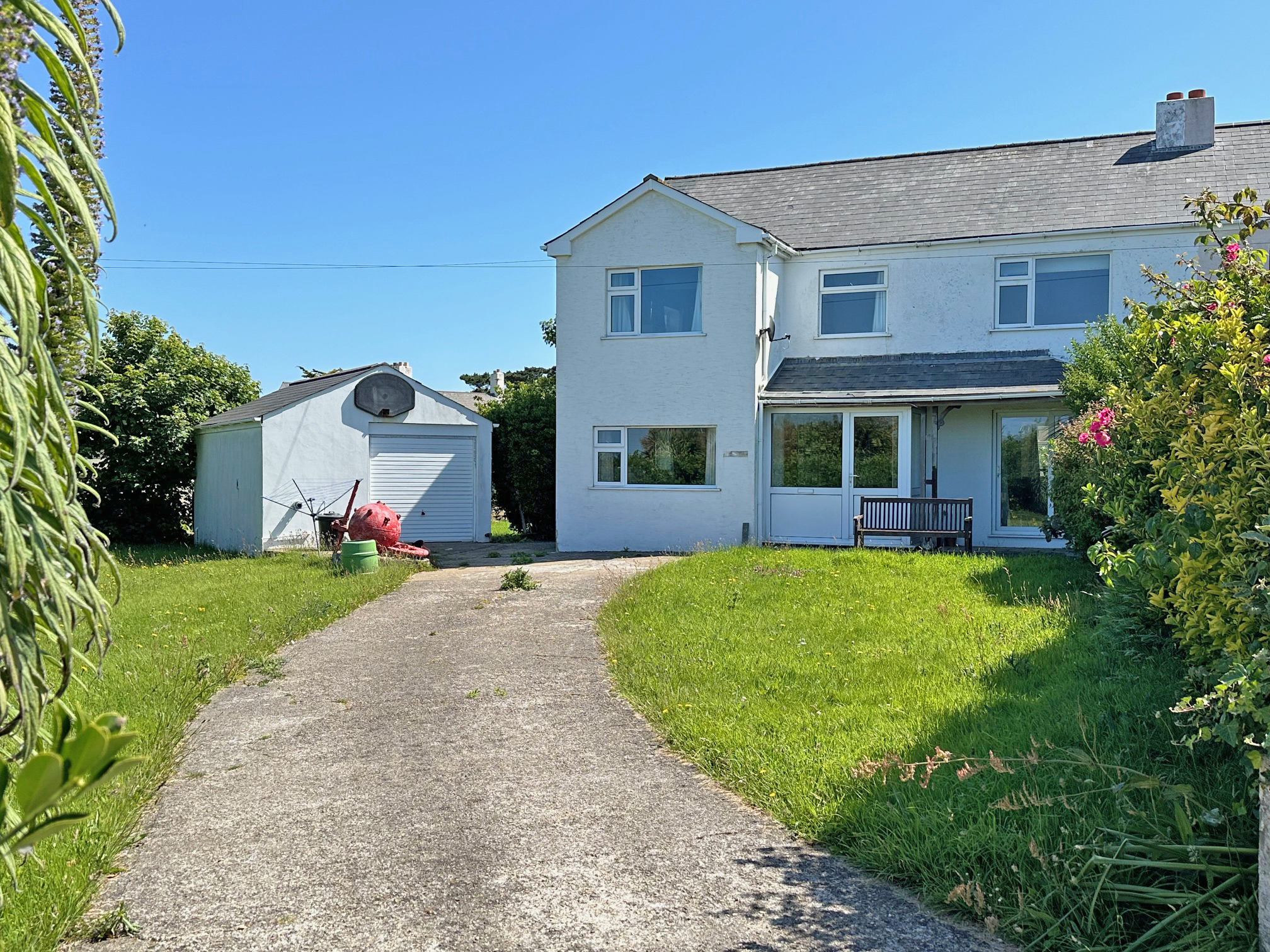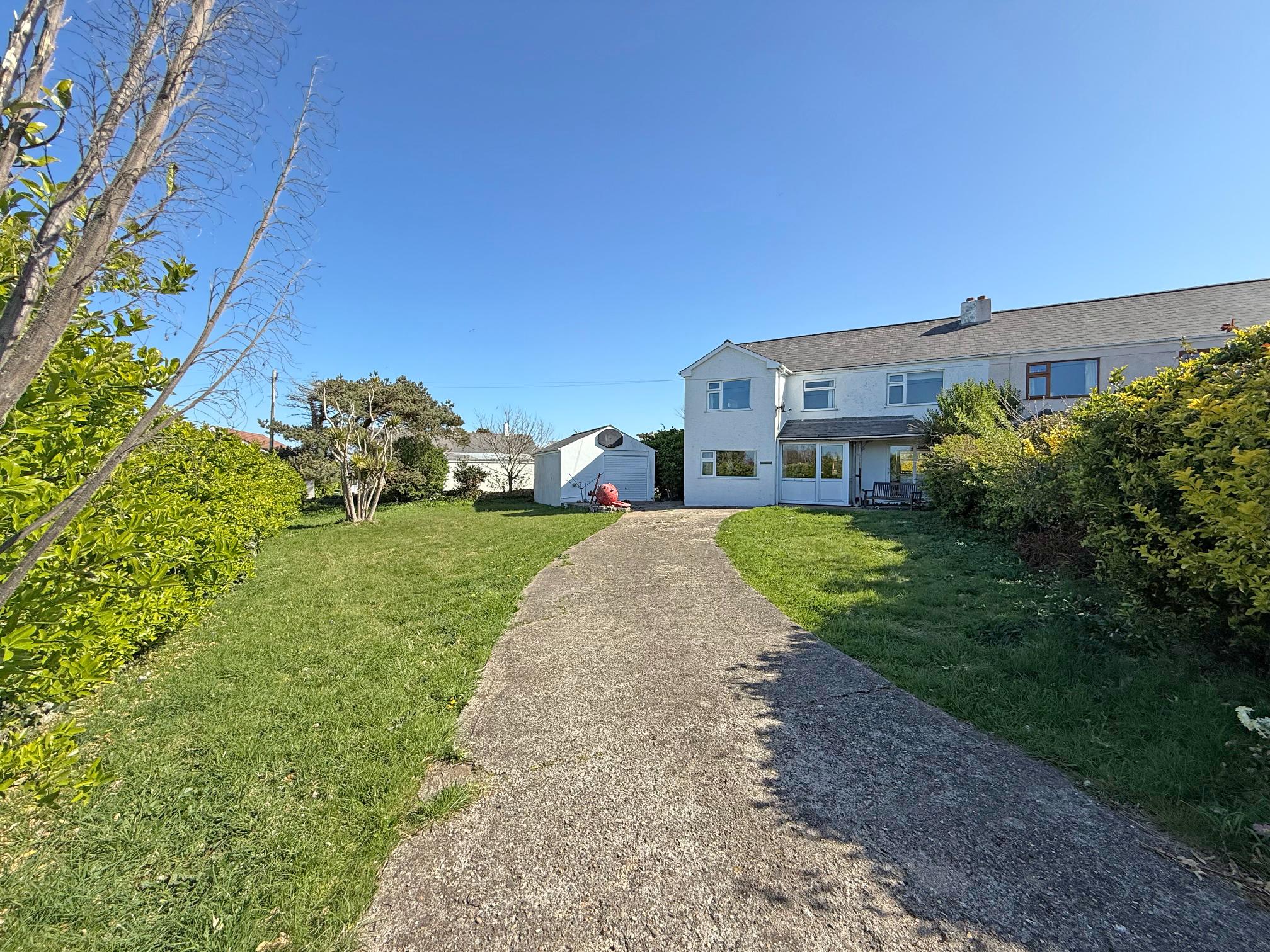 Driveway leading to a garage, offering ample parking and storage. The gardens are mainly laid to lawn.