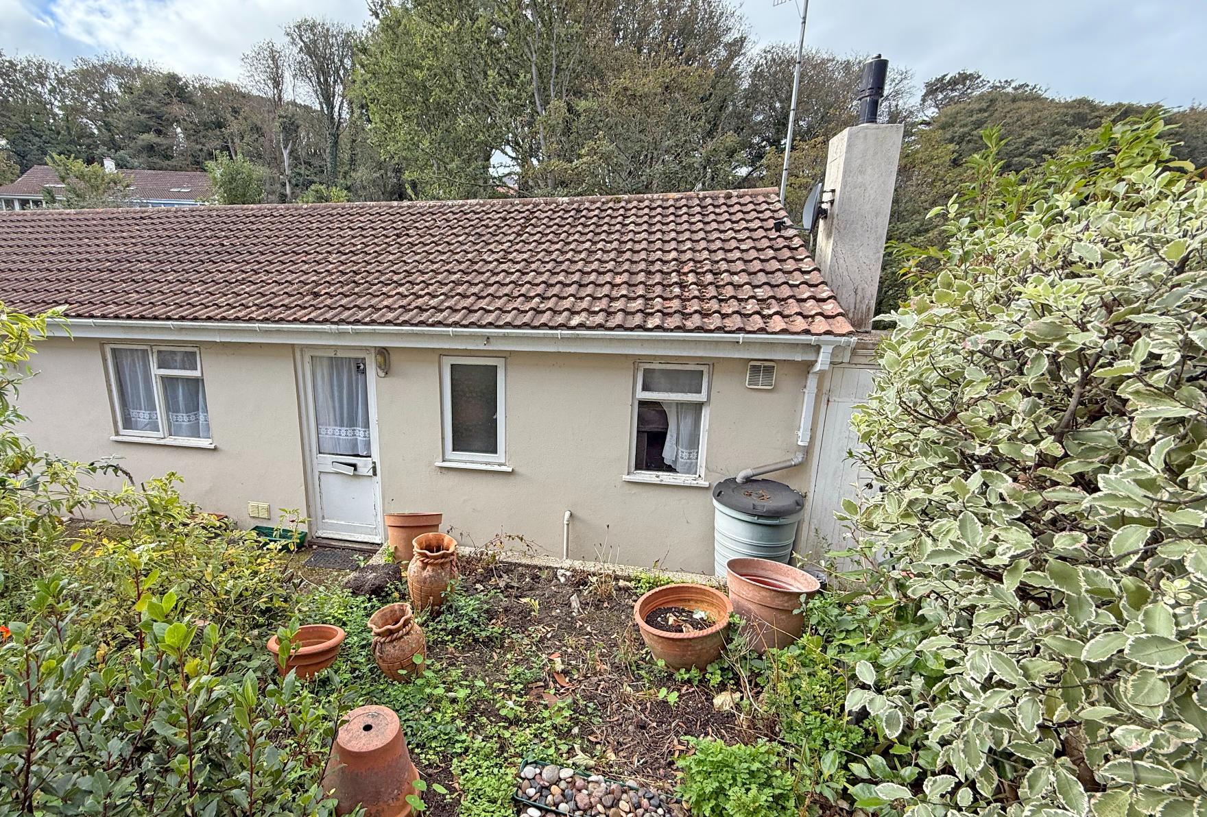 The accommodation currently comprises an entrance hall with a bedroom and bathroom to either side, leading through to a living room with a galley-style kitchen off and a second bedroom. Outside, there is a small area of garden adjacent to the property.