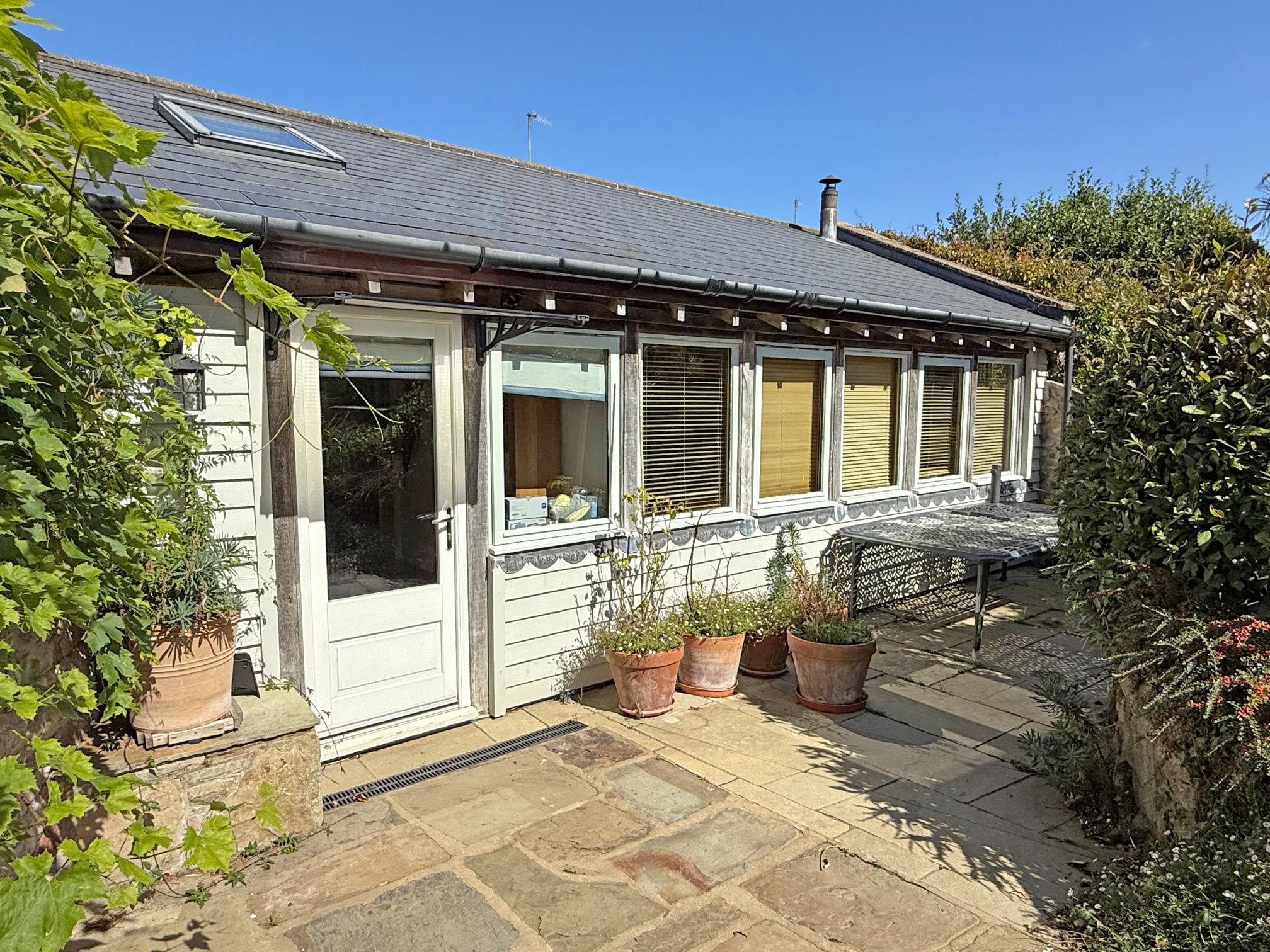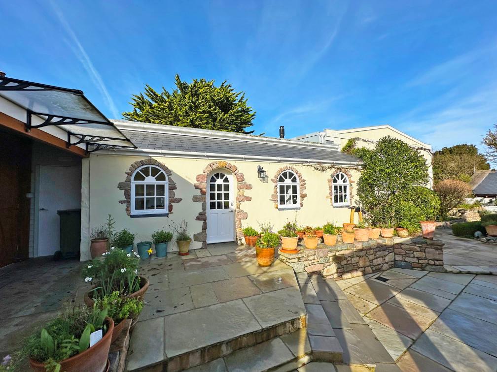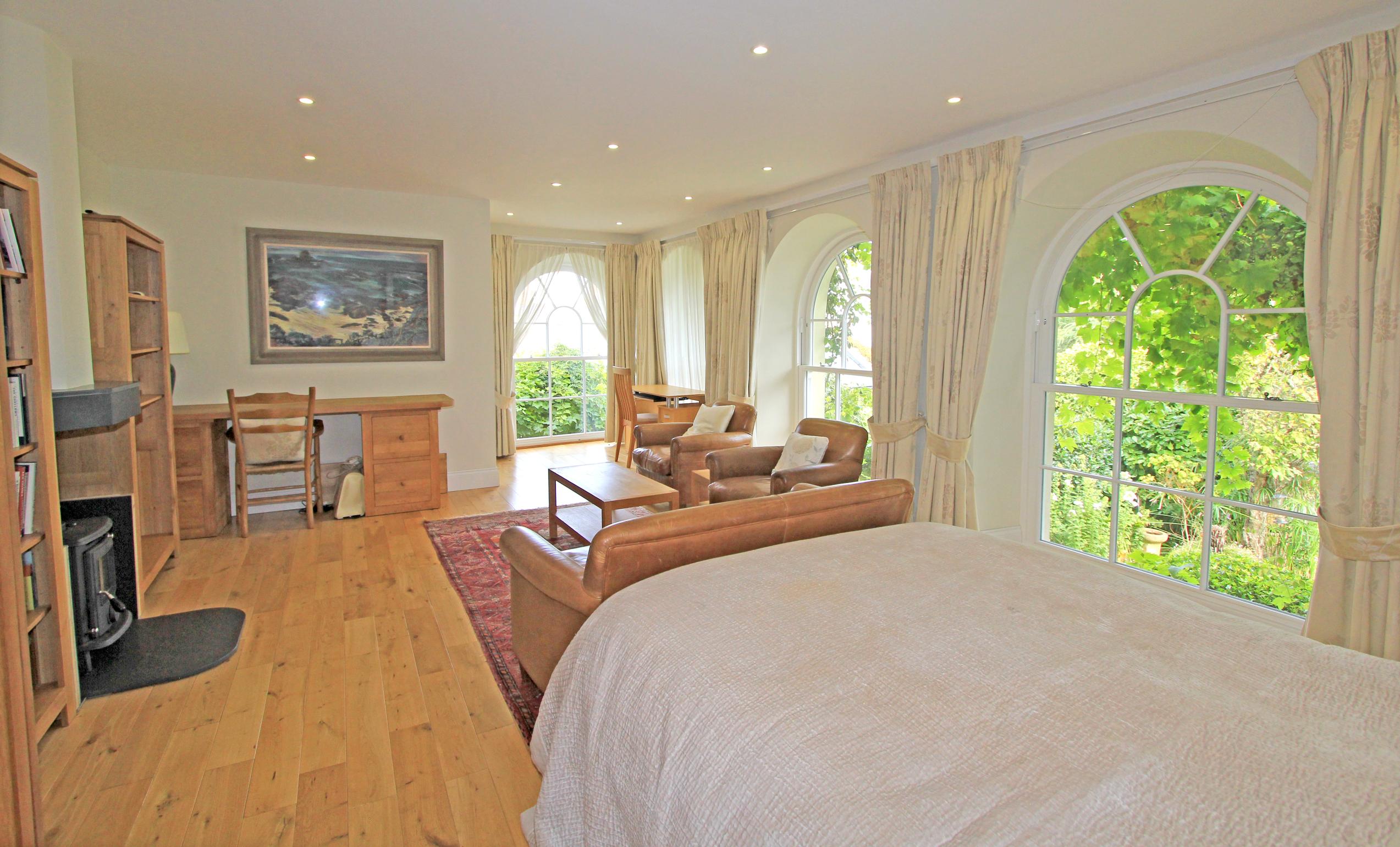 Adding to the property’s charm is The Folly — a stunning detached building with floor-to-ceiling arched windows that frame views of the gardens. Elevated within the grounds, it features a large open-plan living area with a bathroom off, ideal for use as a guest suite, studio, or peaceful retreat. Set just below The Folly in its own private nook is a jacuzzi, offering the perfect spot to unwind.