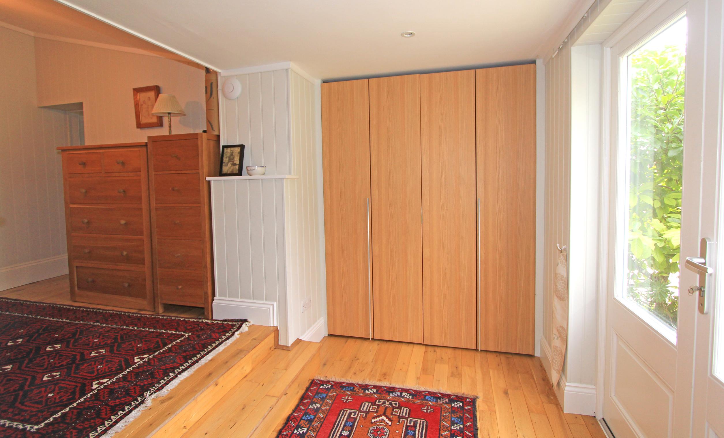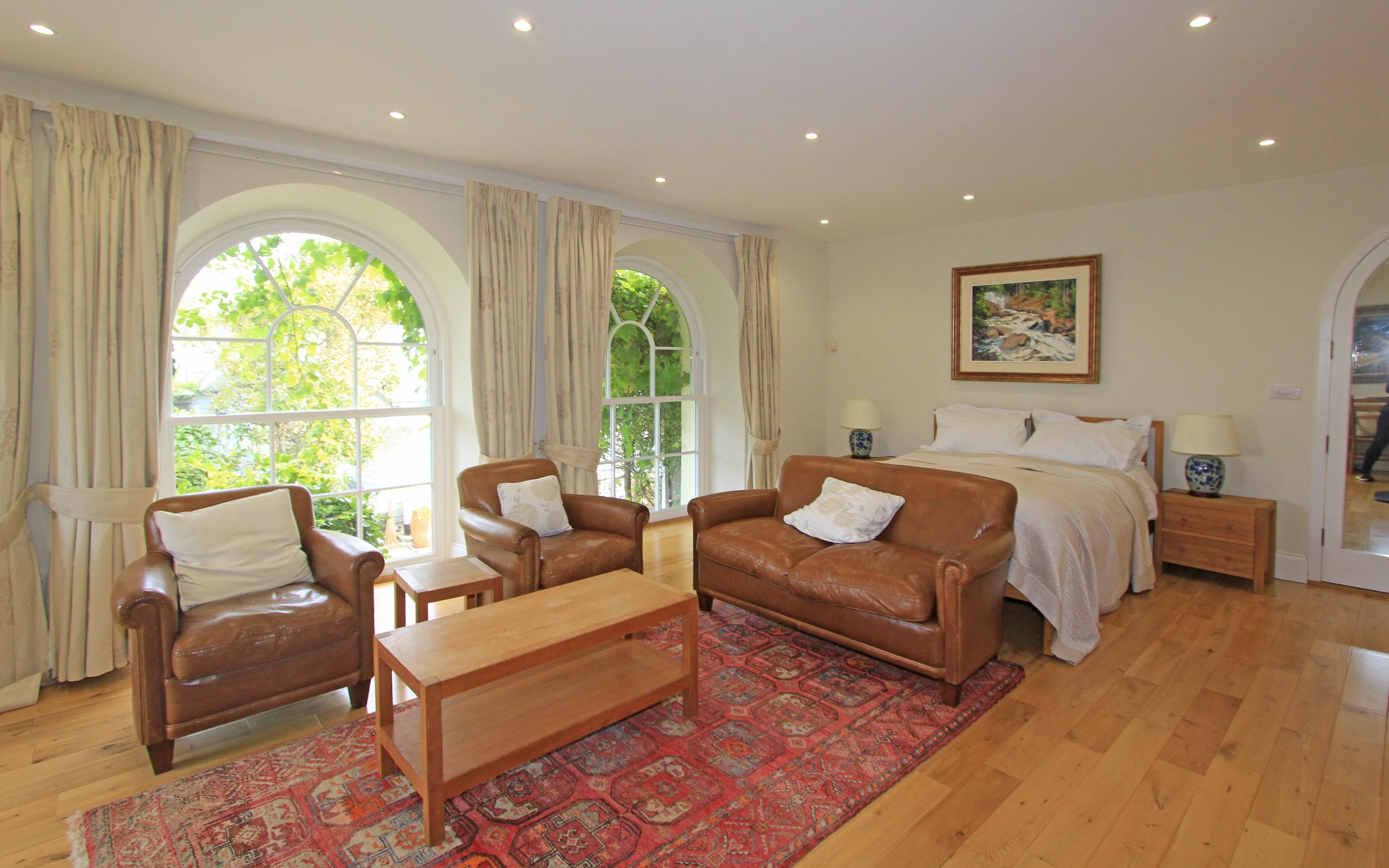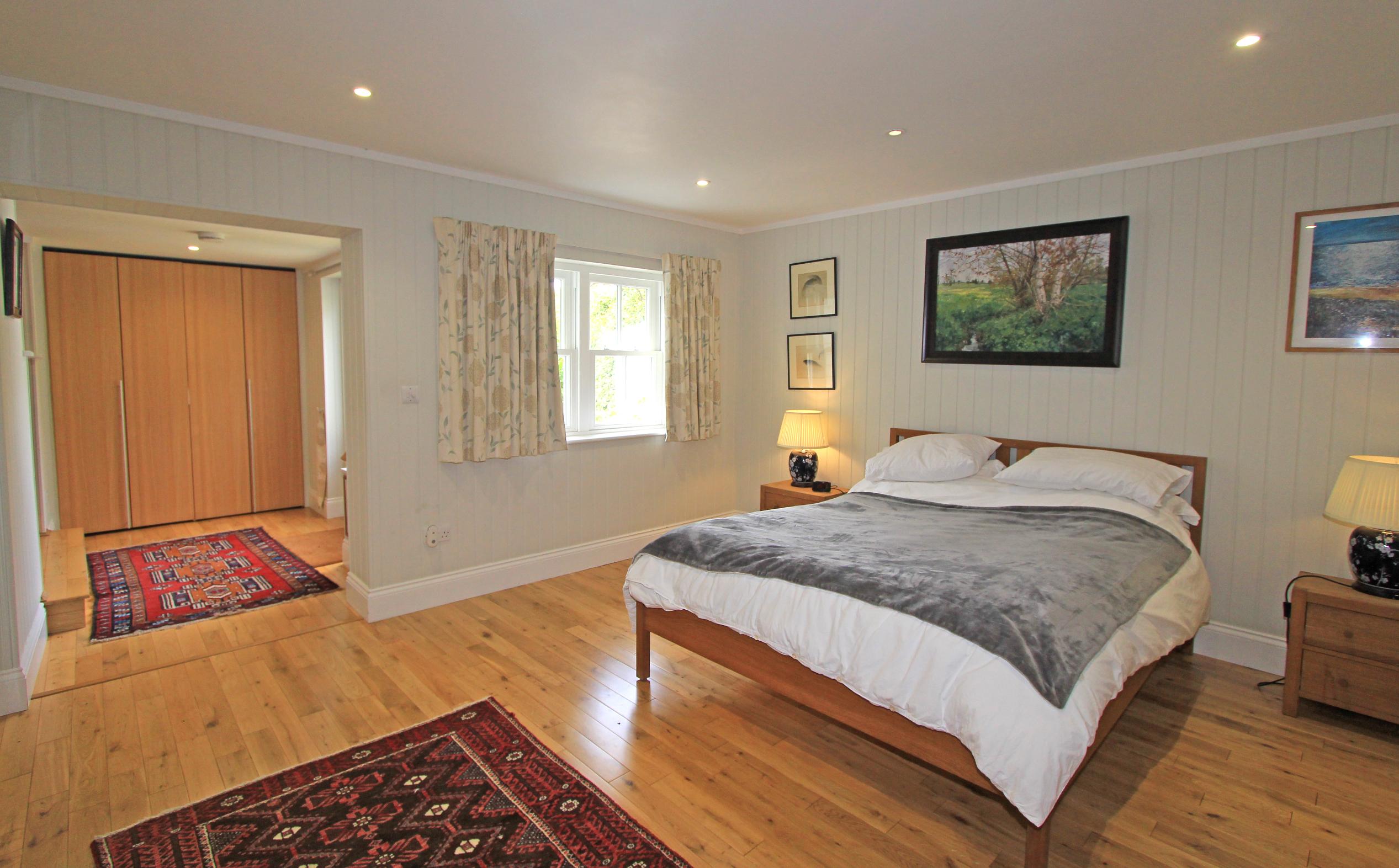 An inner hall leads to a family bathroom and onward to the principal bedroom suite, set apart in its own private wing. This inviting retreat offers a shower room, a spacious dressing room, and a bedroom with direct access to the garden. Two further bedrooms and an additional bathroom complete this floor.