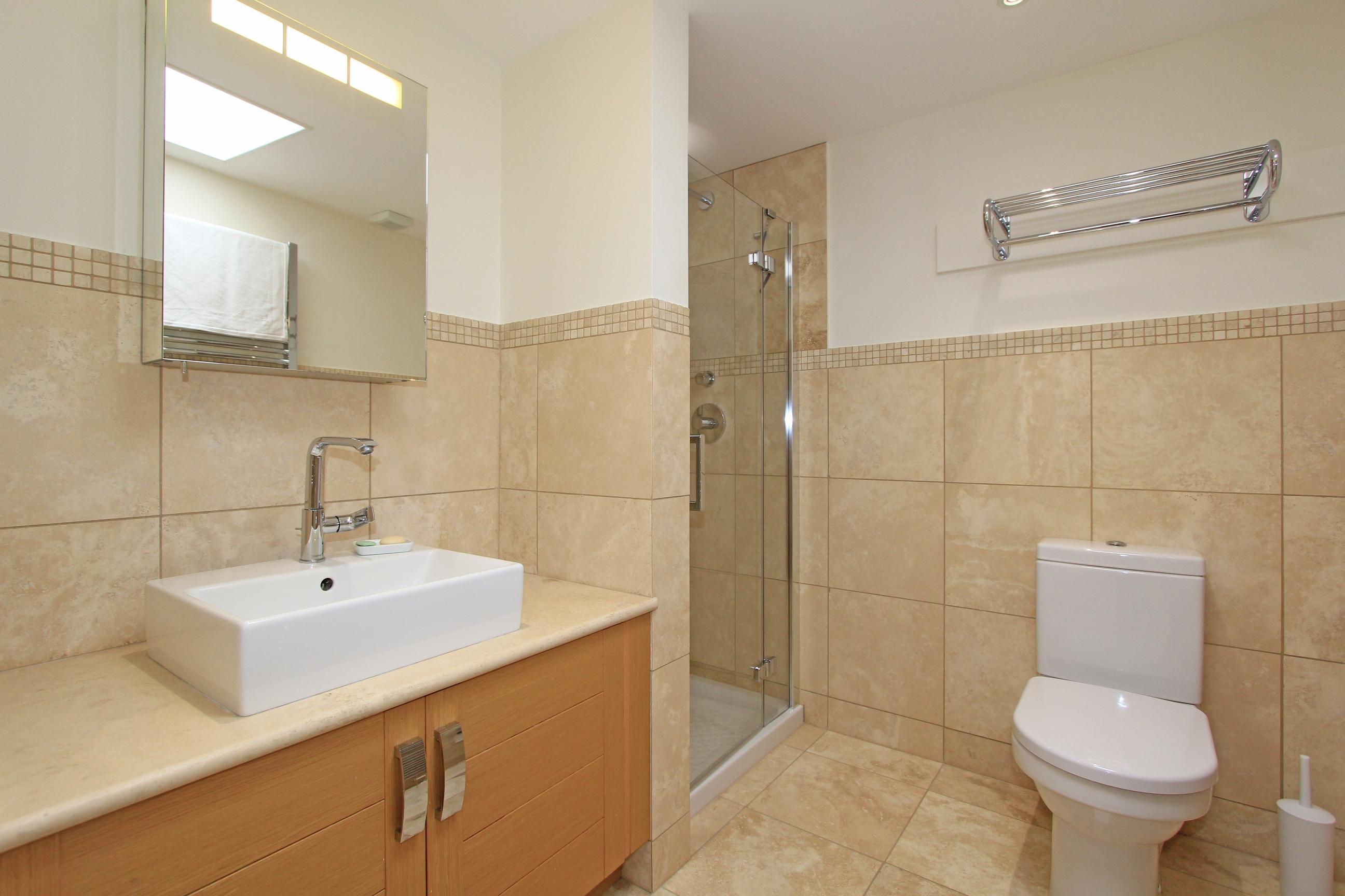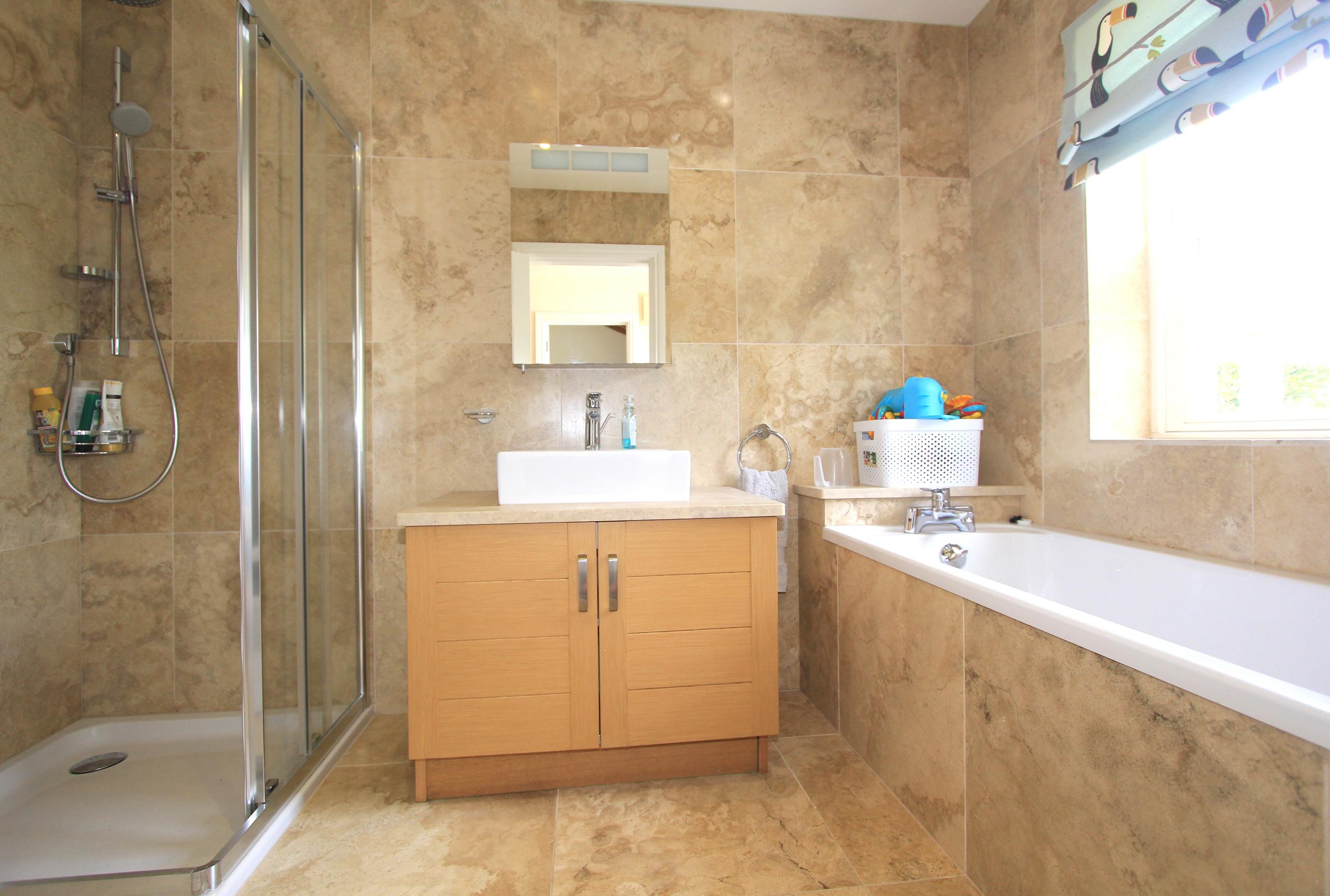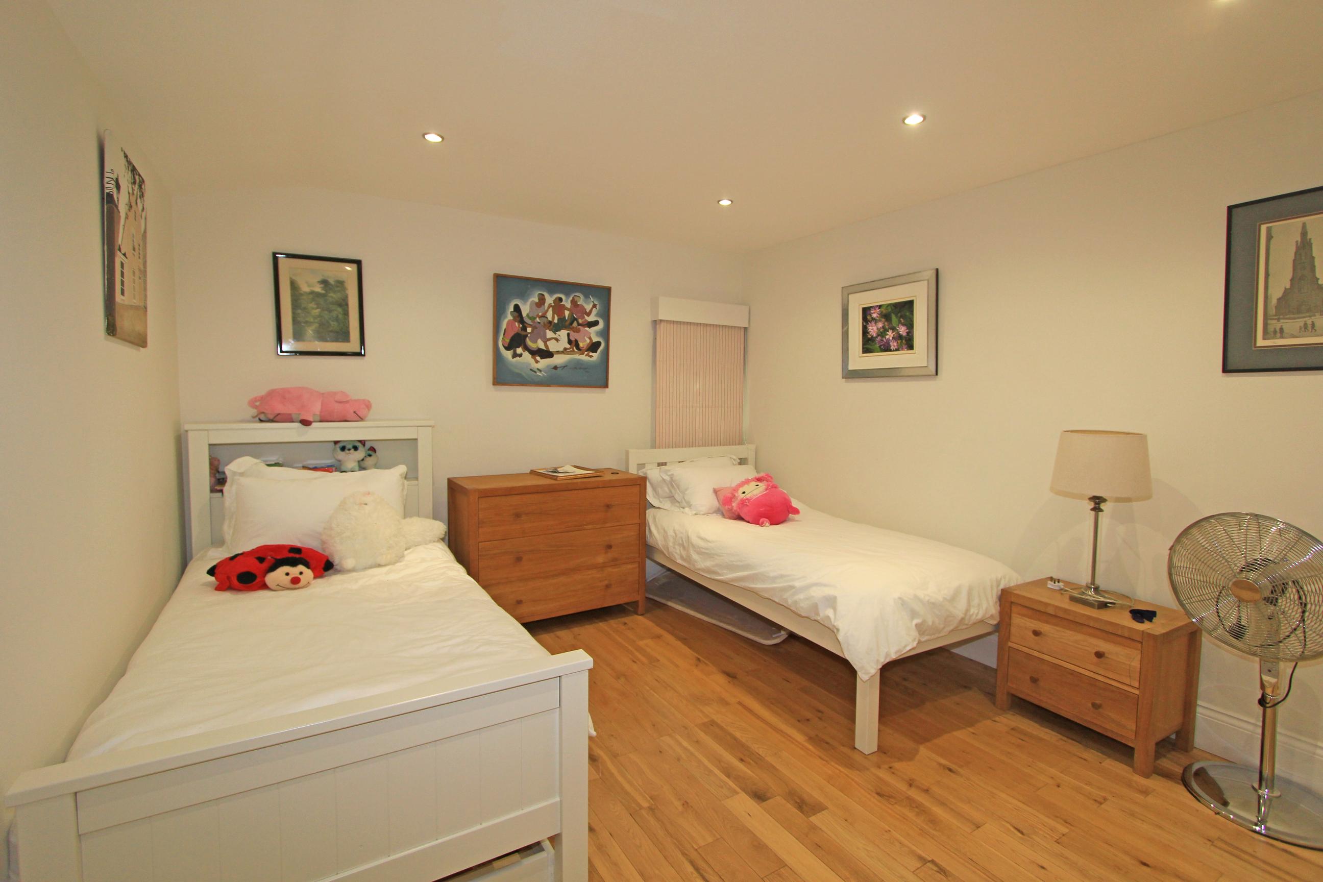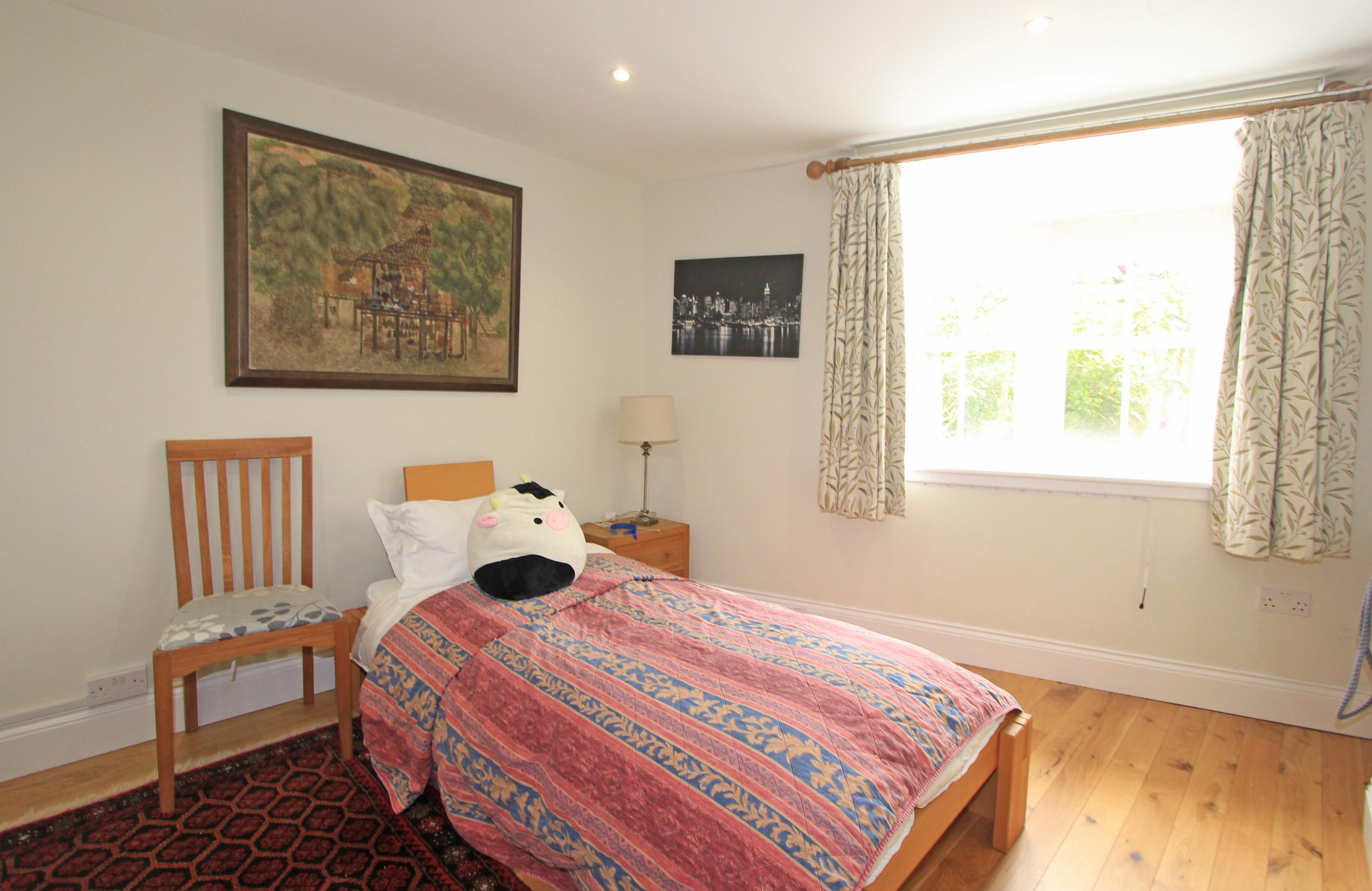 An inner hall leads to a family bathroom and onward to the principal bedroom suite, set apart in its own private wing. This inviting retreat offers a shower room, a spacious dressing room, and a bedroom with direct access to the garden. Two further bedrooms and an additional bathroom complete this floor.