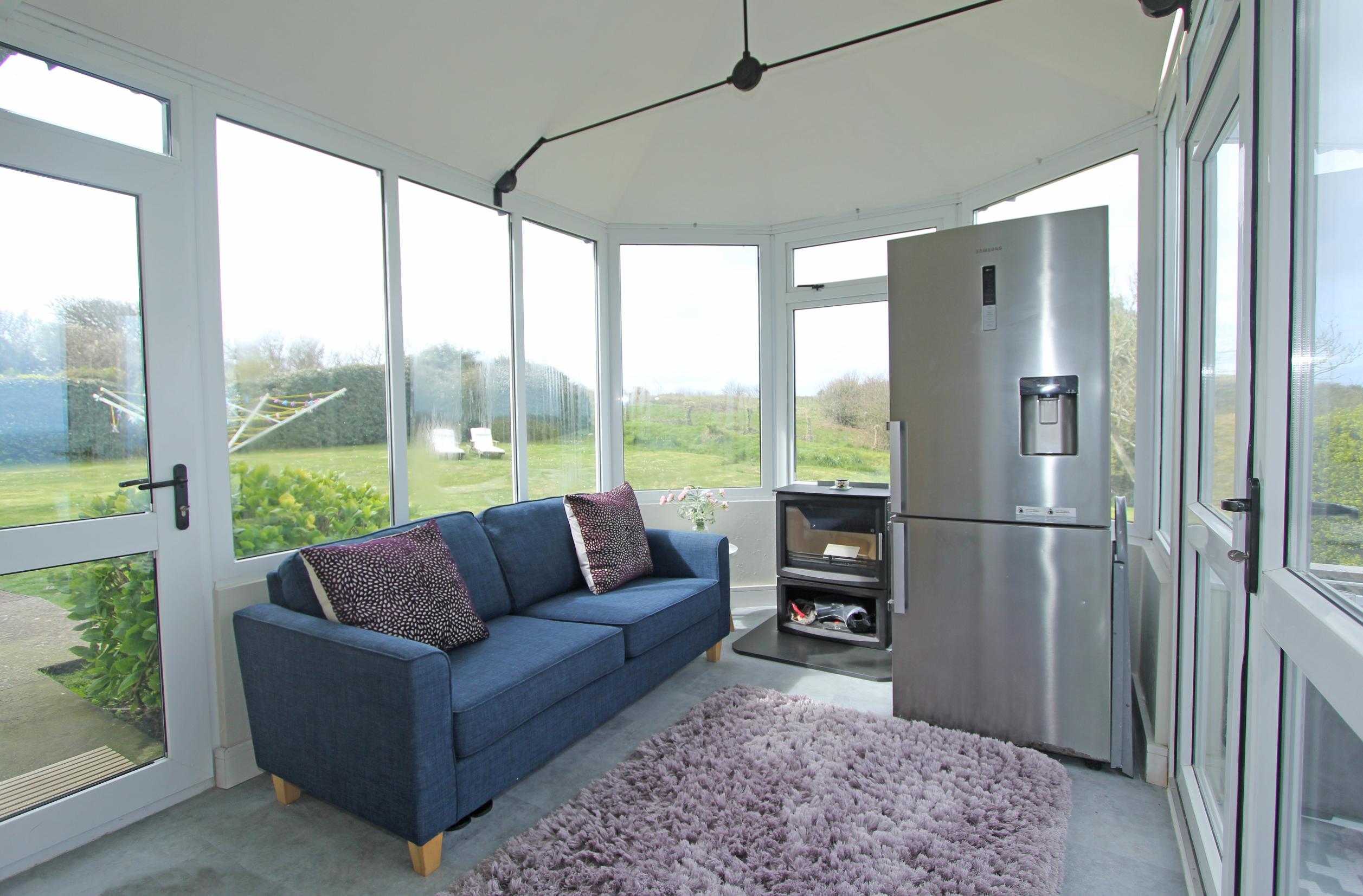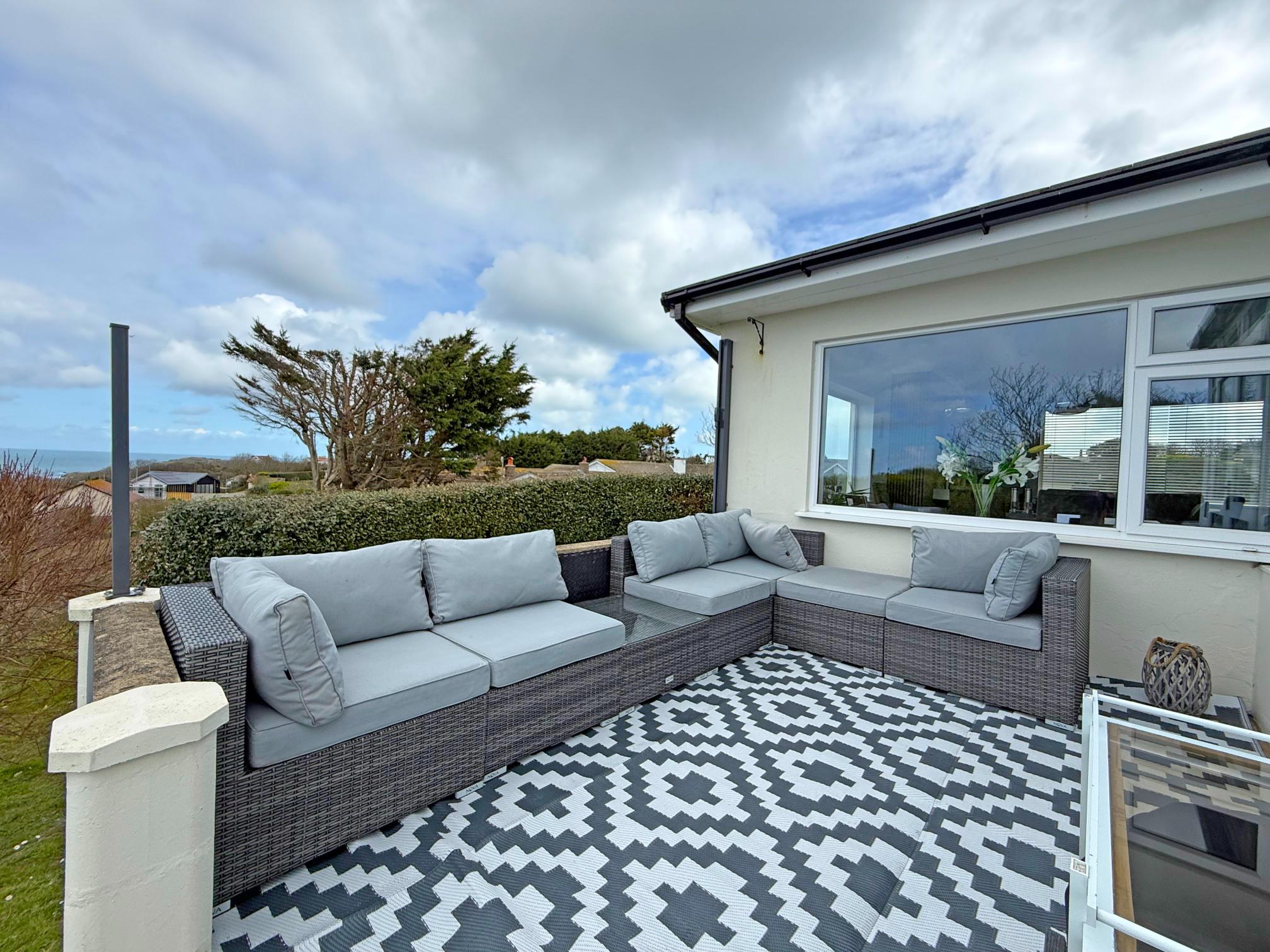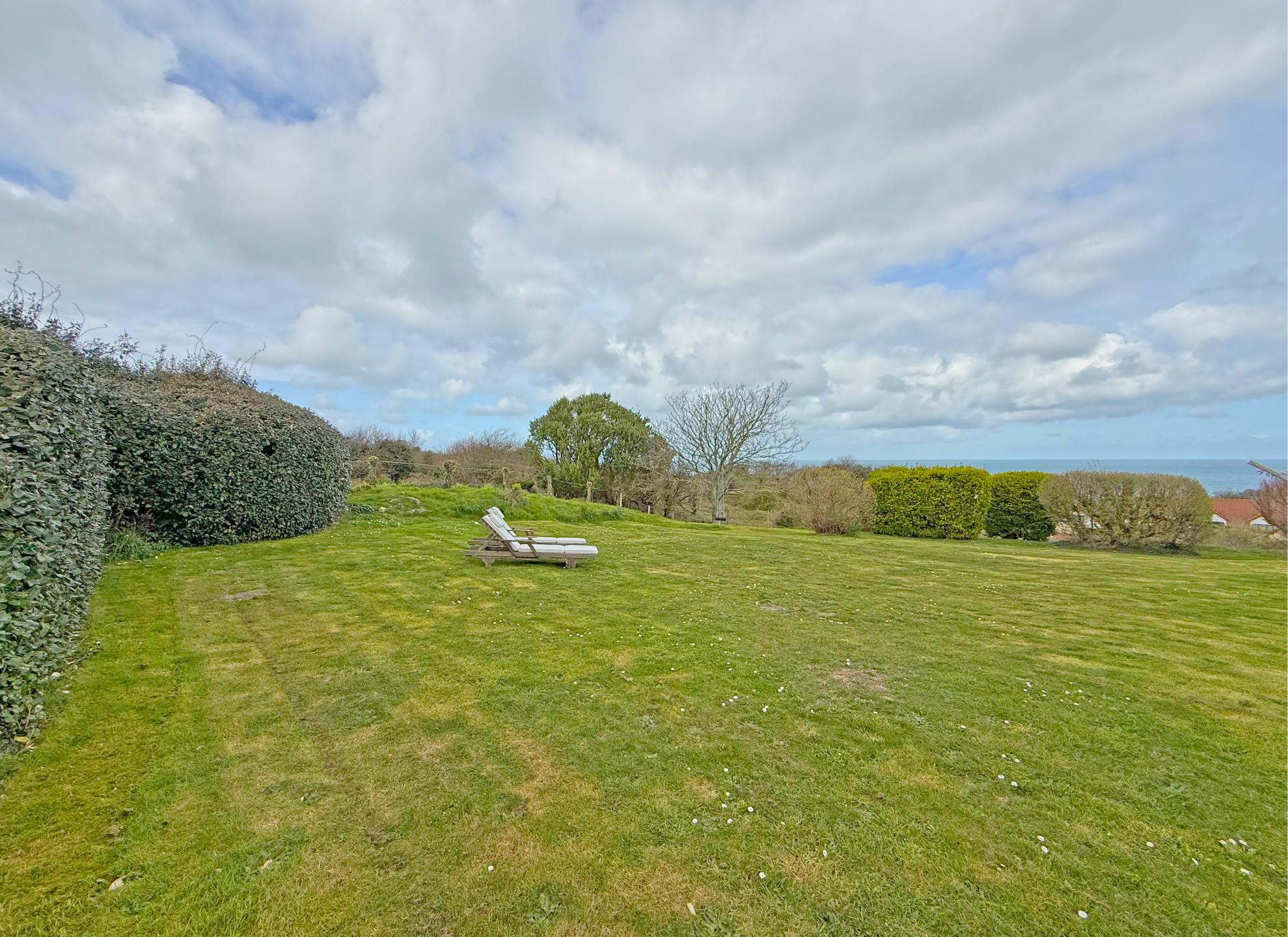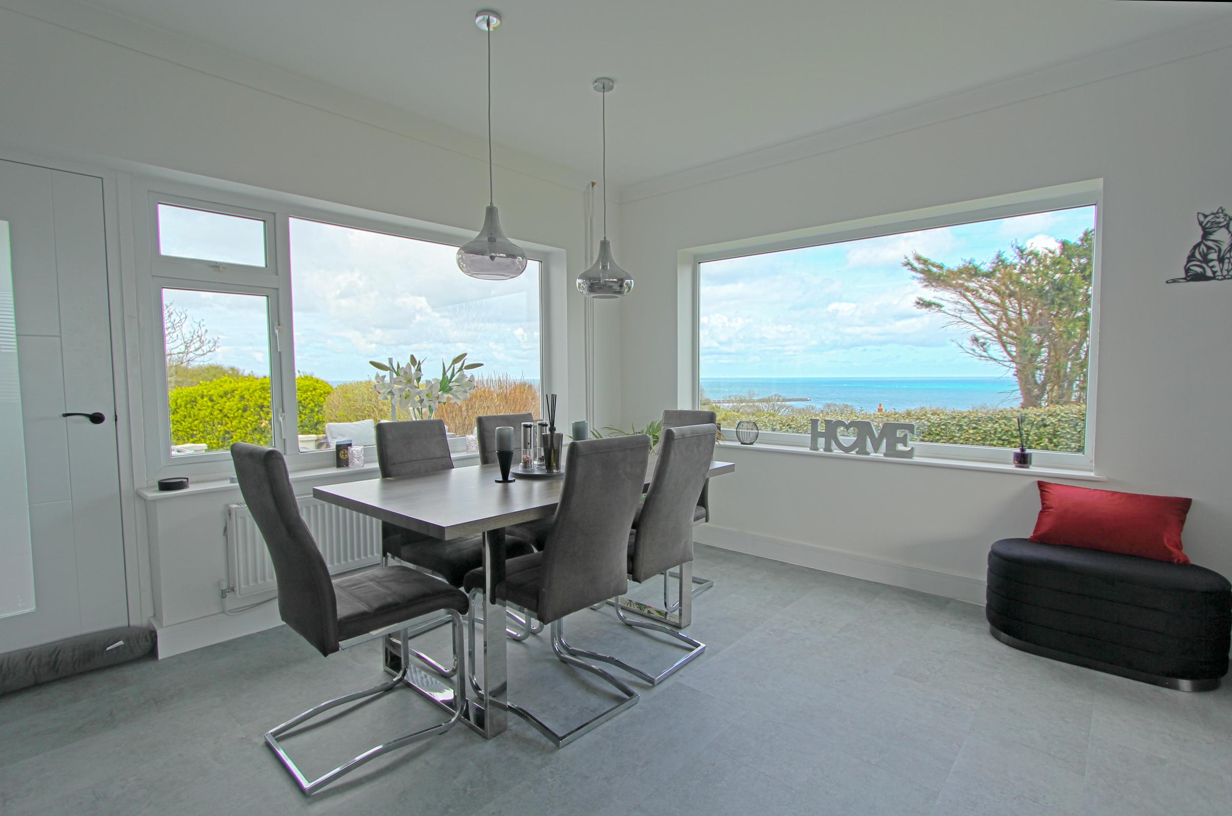 An entrance hall leads into the open plan living space. This includes a living room and dining area, perfectly positioned to enjoy sea views across Braye Harbour. The newly fitted kitchen complements the space with modern finishes and practical design.