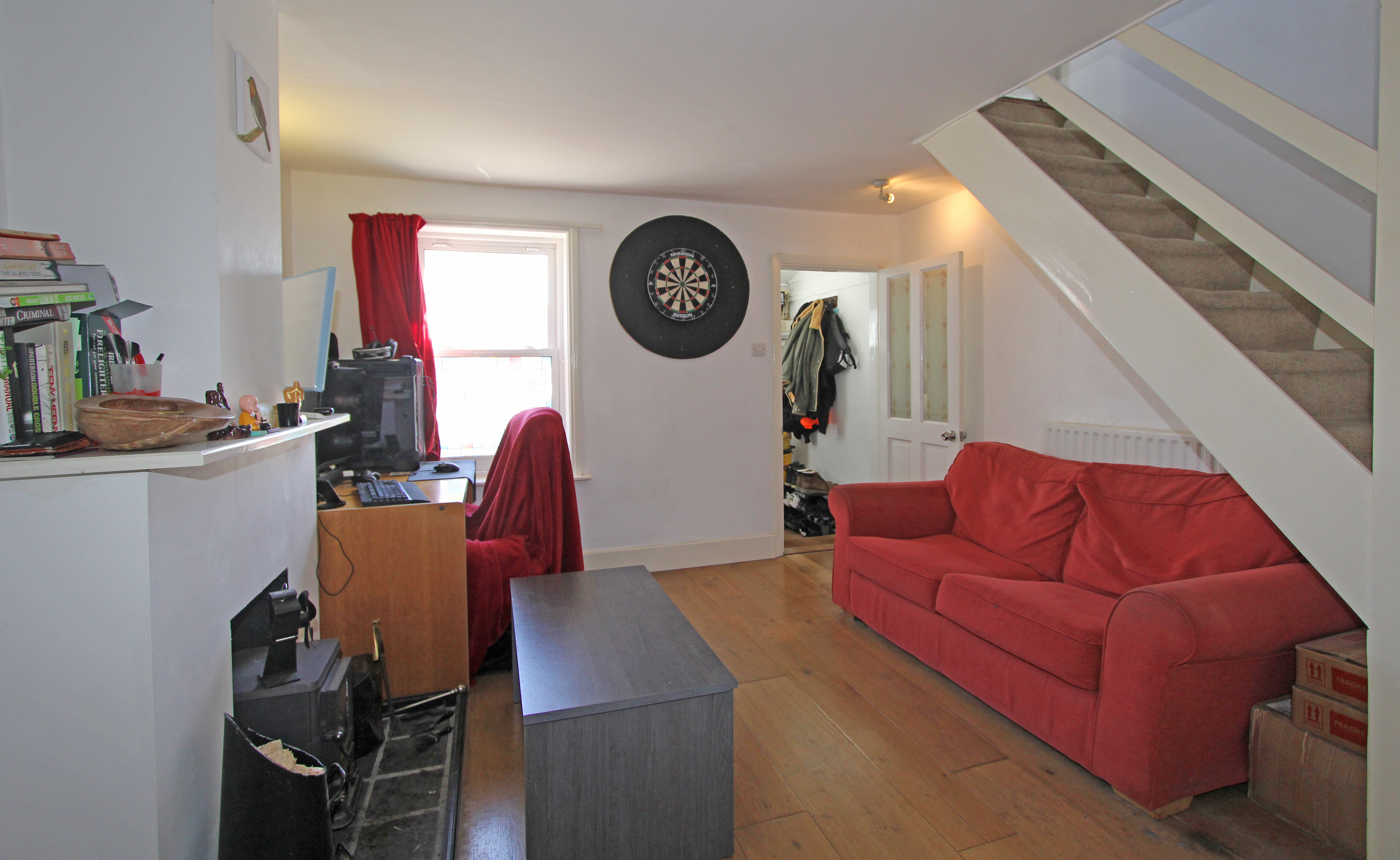 The ground floor is entered via a porch leading into a living room, which flows through to the kitchen. On the first floor, there is a double bedroom with fitted wardrobes, complemented by an ensuite shower room.